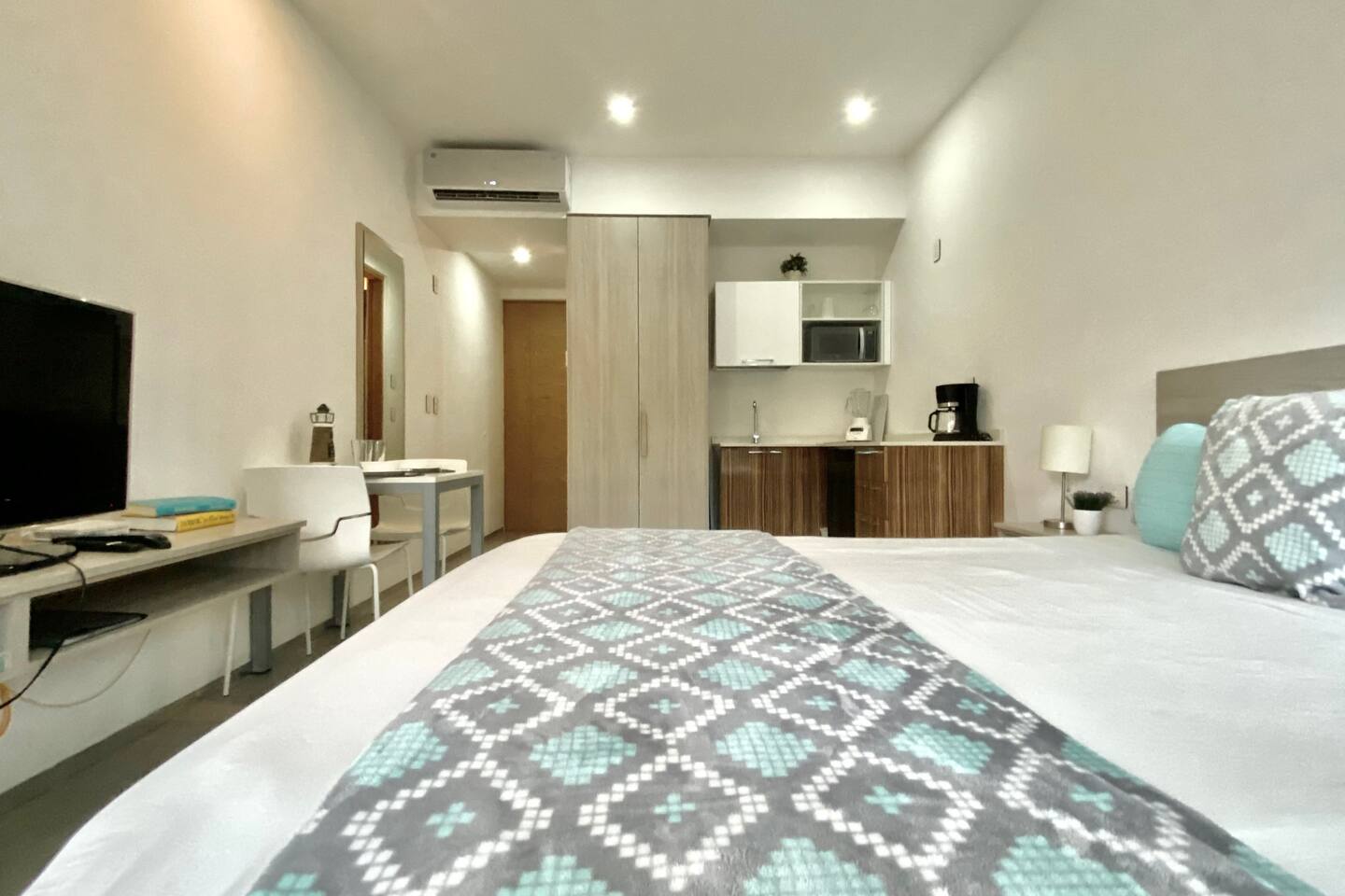 This modern apartment with luxury finishes is the perfect place for your stay in Playa del Carmen. Fully furnished and equipped, it includes Wi-Fi, a super comfortable double bed, TV in the bedroom, air conditioning, and towels for both the bathroom and the beach. The kitchen has everything you need: refrigerator, stove, microwave, blender, coffee maker, and more—perfect for preparing a delicious breakfast or a romantic dinner. You’ll also love the charming private terrace with a table and chairs, ideal for relaxing with a glass of wine, reading your favorite book, or simply enjoying the tropical atmosphere. Everything you need for an unforgettable vacation is right here!