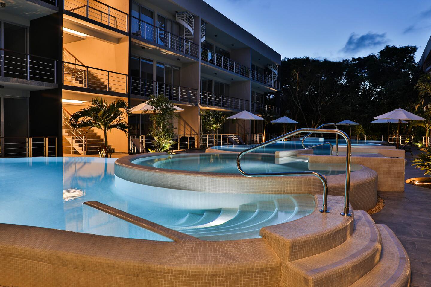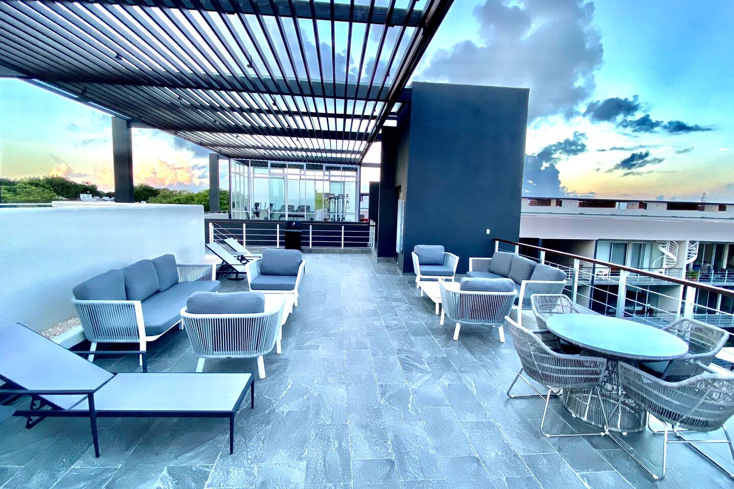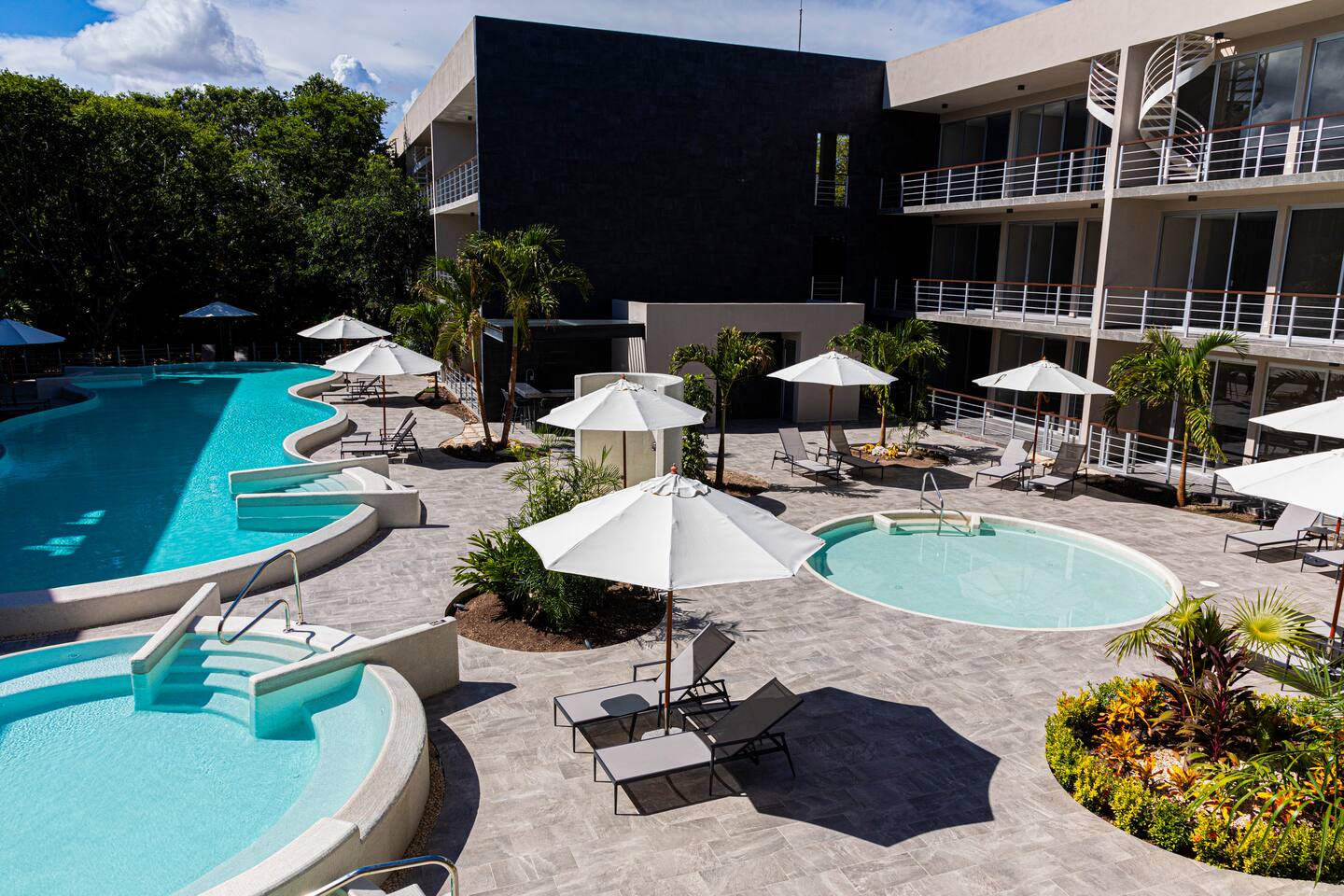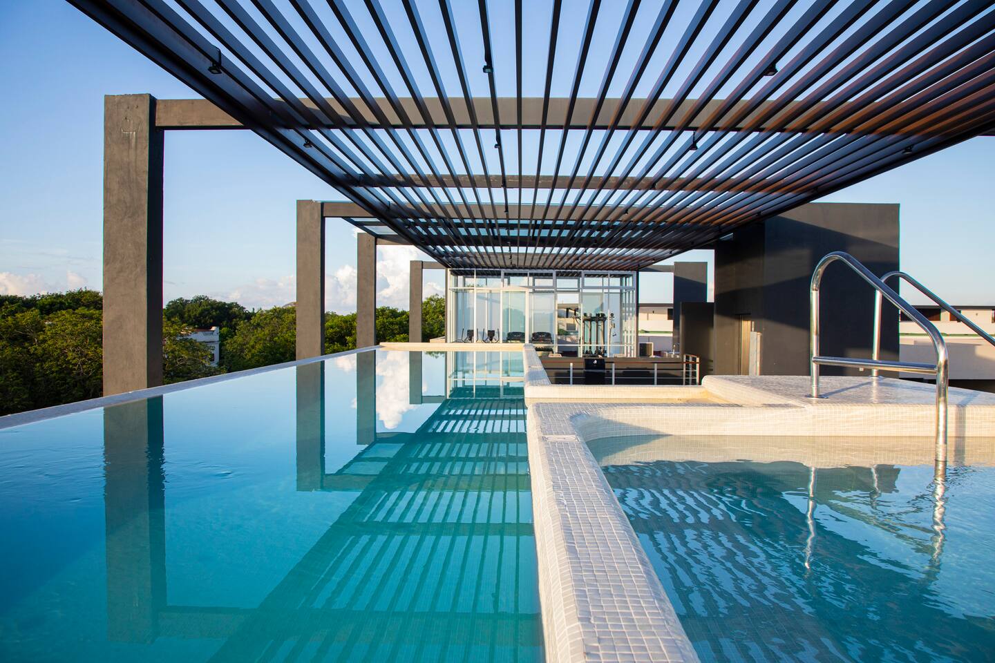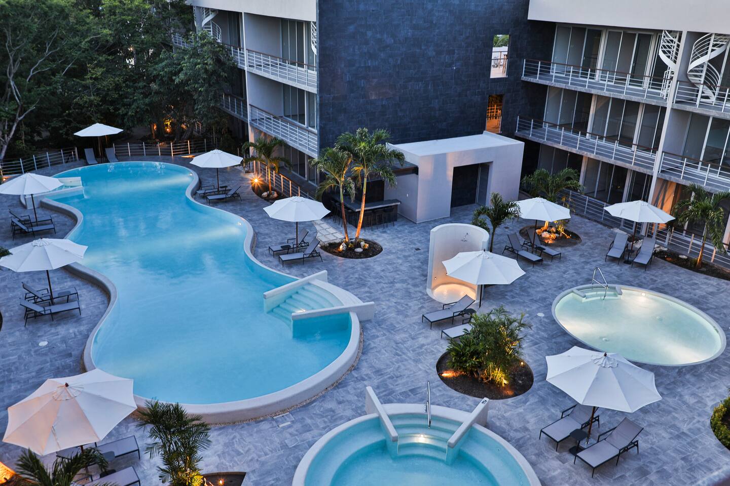 An upscale penthouse that sits on the third floor and boasts an entire wall of windows which naturally frame the lush views. An ample terrace with a comfortable hammock and a cozy outdoor sala presents an optimal vantage point from which to savor great vistas and enjoy a peaceful siesta Playa’s enviable warm weather climate. A winding staircase ascends to your own private rooftop where all you can hear are the cheerful songs of the local wildlife in the nearby towering palms. The rooftop has a shaded comfortable sala and 2 loungers, all in a discreet setting. This stunning property features 3 pools at the ground floor, and an impressive infinity pool at the roof top, 2 communal hot tubs (one at the ground floor and one at the roof top), a sky lounge with reclining loungers overlooking the immaculately manicured green spaces of Playacar. The rooftop is an adults only area.