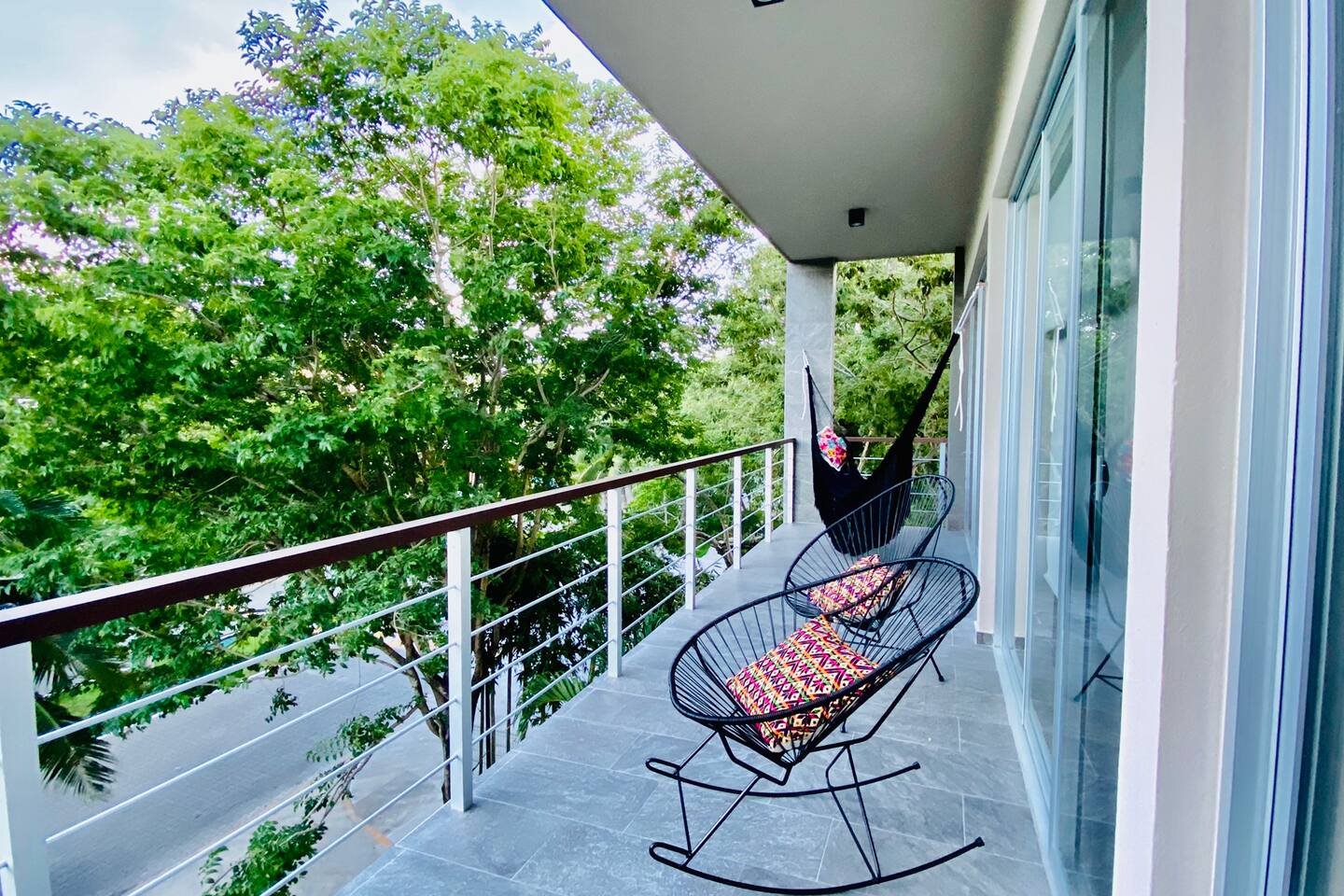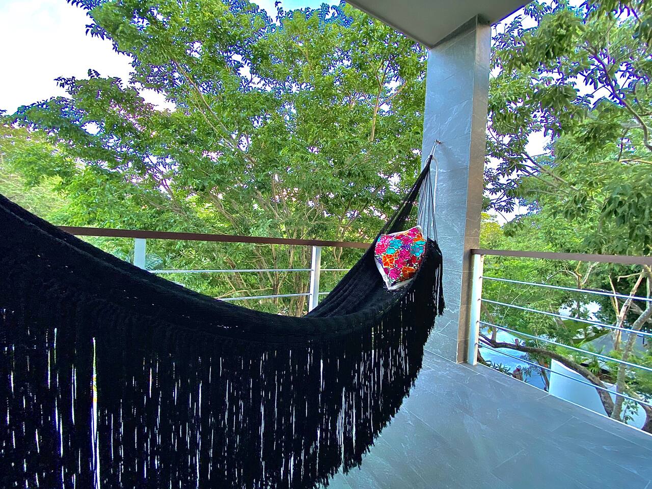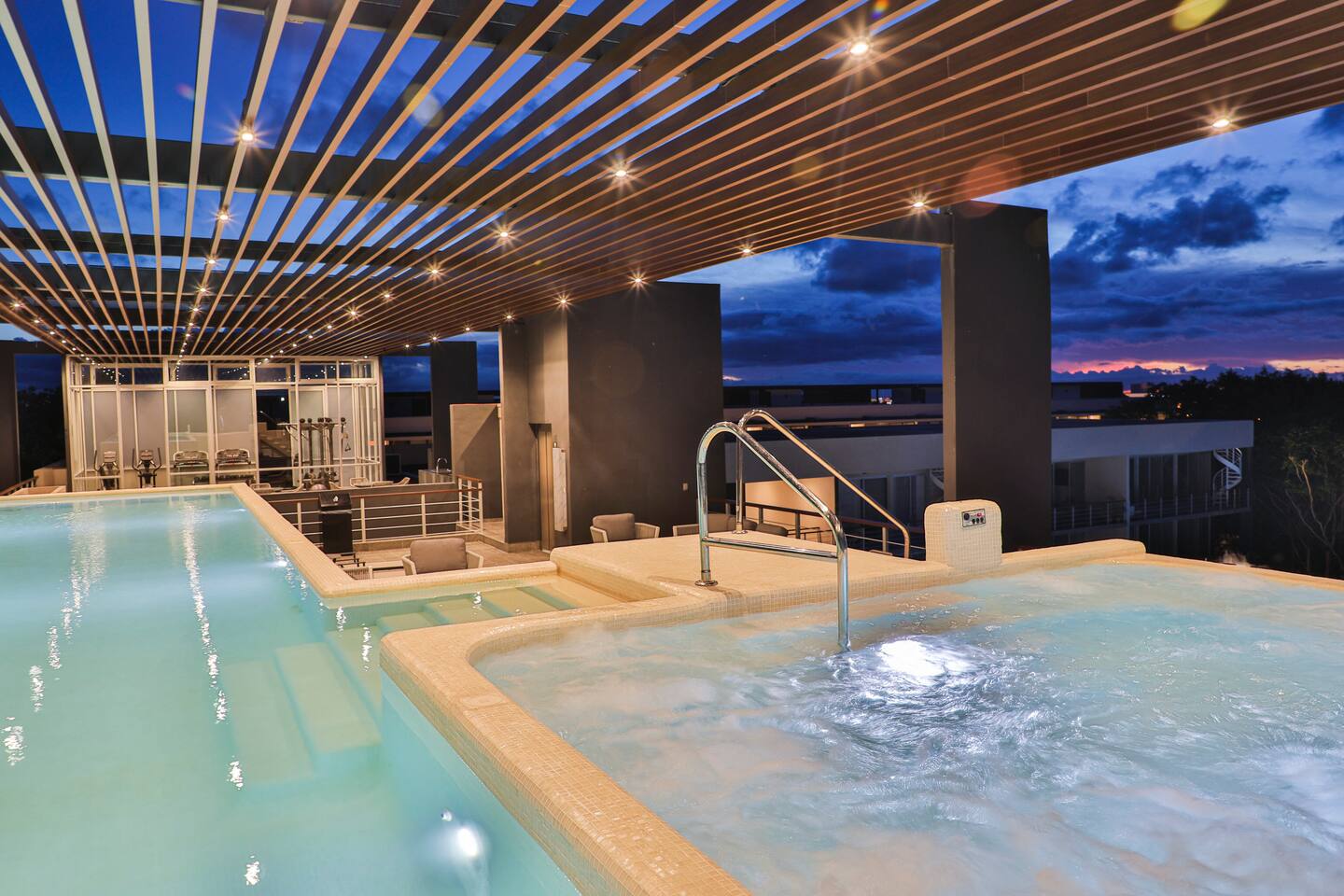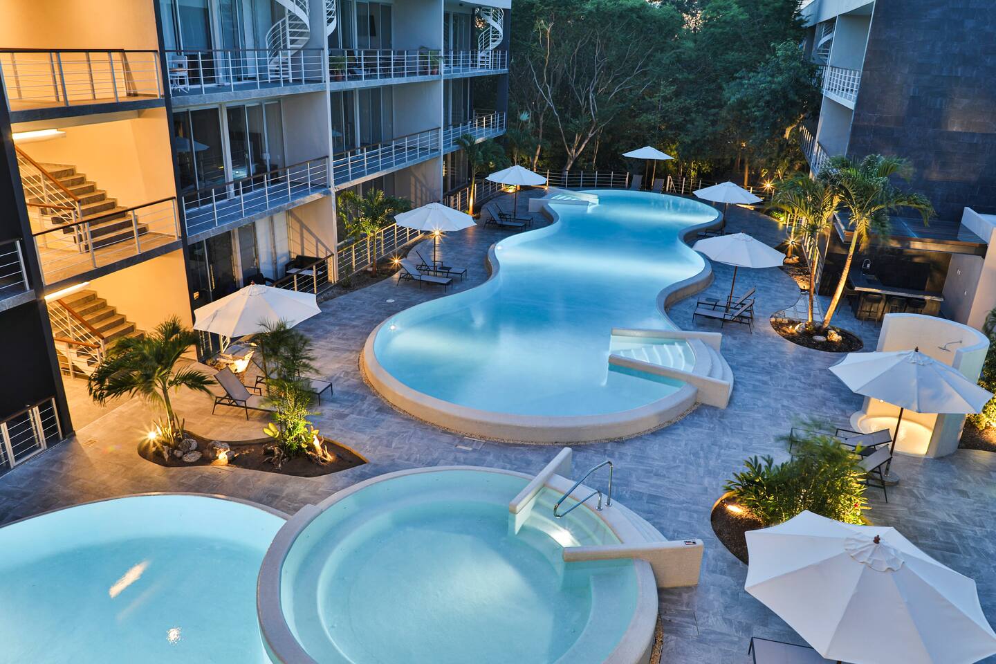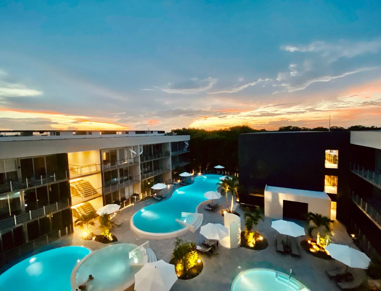 An upscale penthouse that sits on the third floor and boasts an entire wall of windows which naturally frame the lush views. An ample terrace with a comfortable hammock and a cozy outdoor sala presents an optimal vantage point from which to savor great vistas and enjoy a peaceful siesta Playa’s enviable warm weather climate. A winding staircase ascends to your own private rooftop where all you can hear are the cheerful songs of the local wildlife in the nearby towering palms. The rooftop has a shaded comfortable sala and 2 loungers, all in a discreet setting. This stunning property features 3 pools at the ground floor, and an impressive infinity pool at the roof top, 2 communal hot tubs (one at the ground floor and one at the roof top), a sky lounge with reclining loungers overlooking the immaculately manicured green spaces of Playacar. The rooftop is an adults only area.